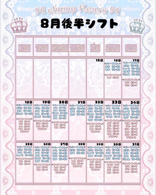 固定𝐂𝐡𝐚𝐦𝐩 𝐟𝐥𝐞𝐮𝐫─しゃんふるーる─コンカフェ大阪@champ_fleur_·🍉8月後半シフト🍉 【営業時間】 🏰18:00-5:00 🎀圧倒的かわいさNo.1コンカフェ🎀 ⭐️キャスト募集中⭐️ ご応募はこちらから↓ http://lin.ee/8CKoCV6 #コンカフェ #コンカフェ大阪2112,229