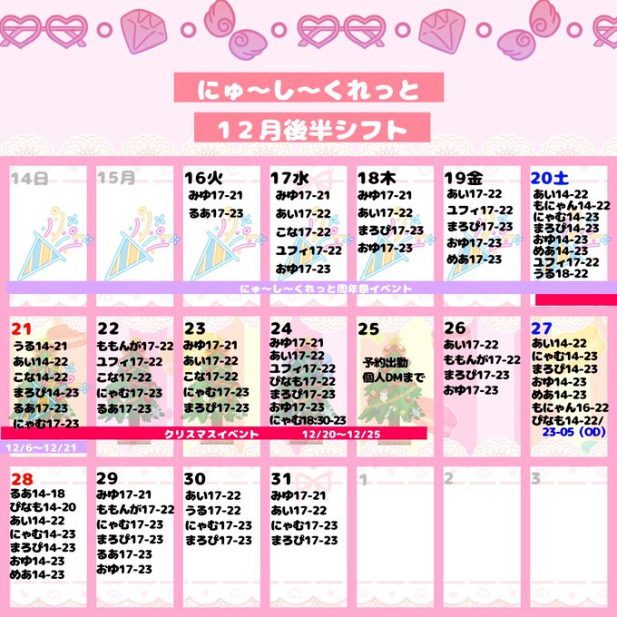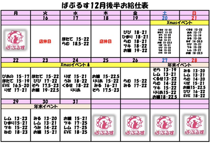 難波・日本橋 ばぶるす固定Cafe&Bar ばぶるす@bubbles_nanba·🐈ばぶるす12月後半お給仕表🐈⬛ 【イベント詳細】 20日(土)〜〜26日(金) 🎄Xmasイベント🎁✨ 27日(土)〜〜31日(水) 🦄˚✧₊年末イベント˳✧༚📣 *31日ばぶるす🐈合同営業になります! 皆様のご帰宅心よりお待ちしております🐈🎵 ↓遠隔サイト💖 http://bubblesosaka.base.shop129