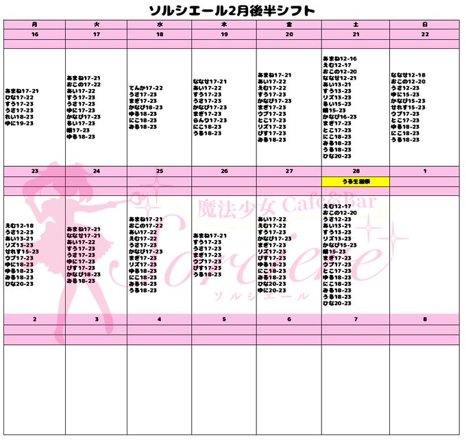 💎episode168💎店休日2/24さんがリポストしおり@shi0ri_168·2月後半予定♡ 21日 17~22 23日 17~22 26日18~22 28日 17~22 3/1 17~22 21.22.23 屋台村168🍢💛 27.28.3/1 メイドイベントʚ🎀ɞ 3/1 かれんちゃんお誕生日会💗 16.17.24 定休日🌙*゚116205