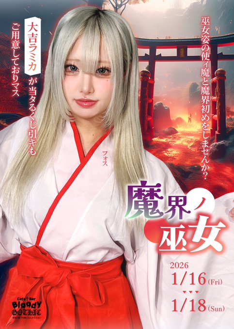 難波・日本橋 クロナイクロナイ┃大阪・日本橋🦇魔界コンカフェ@bloody_gothic_·✨🎍⛩御案内⛩🎍 ✨ 魔界ノ巫女 2026年1月16日(金)〜1月18日(日)迄 🐴巫女姿の使イ魔チャンと一緒に 2026年初イベントを楽しみまショウ🌅 大吉が当たる⁉️くじ引きで運試しモあり〼😈🩸 #コンカフェ #大阪 #ゴシック13574