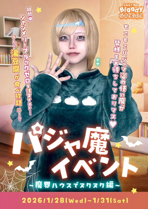 難波・日本橋 クロナイクロナイ┃大阪・日本橋🦇魔界コンカフェ@bloody_gothic_·💤🌃御案内🌃💤 パジャ魔イベント 〜魔界ハウスでヌクヌク編〜 2026年1月28日(水)〜1月31日(土)迄 冬はもこもこパジャマで可愛く暖かく過ごしまショウ🧤🧡 お家での使イ魔チャンを見られるレアなイベントかも⁉️ 『湯豆腐』食べ放題もありマス…🍲‼️‼️18247