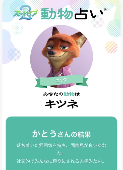 心斎橋・ 宗右衛門 でんぱぷらねっとエリートかとう。@5Ihhl·59分いや、これニックあたしのことすきですやんWWWWWW引用正方形のプロフィール画像ディズニー・スタジオ(アニメーション)公式@DisneyStudioJ_A·7時間✅特設サイト❝#ヤズーJAPAN❞にて “12タイプのズートピア的性格” を診断できる #ズートピア2動物占い が公開✨ あなたはどの動物⁉️ 結果をシェアしよう✍️ 🔮今すぐ占う ▶ https://yz-zootopia2.disney.co.jp/doubutsu-uranai/… ˗ˋˏ #日本ズートピア化計画 ˎˊ˗ 『#ズートピア2』12/5(金)劇場公開🐰🦊1165