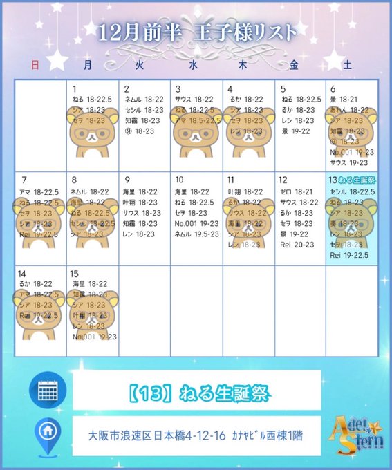 難波・日本橋 Adel Stern エーデルシュテルン固定シア@Shia_AS_427·✙12月前半僕に会える日✙改訂版 3日追加になってます! 19-22.5なのでお気をつけて2182