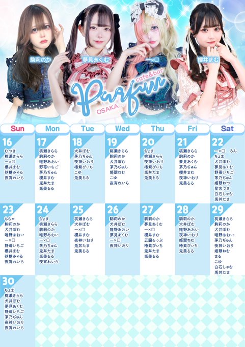 難波・日本橋 パルファン 大阪店夢見あくむ@PALFUN大阪@akumu_pfosk·17時間後半です! バナーにいる⊹⁺⸜(ᐡ⸝ɞ̴̶̷ ·̮ ɞ̴̶̷⸝ᐡ)⸝⁺⊹引用パルファン中の人@pfosk_sub·11月15日✧꒰ 11月後半出勤情報&月間イベントカレンダー ꒱✧ あなたの推しパルファンに ぜひ会いに来てくださいね📷 ※シフトは急遽変更させていただく場合がございます。 #パルファン #パルファン大阪8335