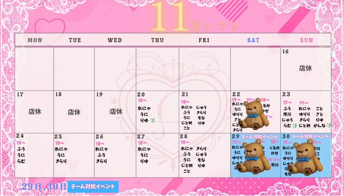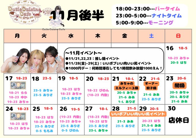 難波・日本橋 cafe &barアンジェール固定なこ@ angelle@NC_O42·❤︎11月後半シフト❤︎ 22日 17:00-23:00 29日 17:00-23:00 30日 17:00-21:00 29.30はチーム対抗イベントです❕絶対に勝ちたいからきてほしい(՞ o̴̶̷̤ ̫ o̴̶̷̤ ՞) 日曜日もめずらしくいてるので会いに来てね🎶16158