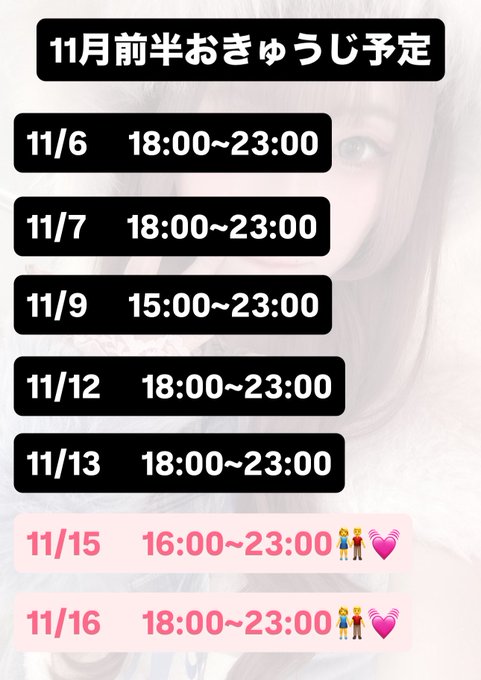 難波・日本橋 Cure Castle(キュア キャッスル)たお@0__tao__0·11月16日すみません(;_;)私用でだいぶ遅れてます🥲引用たお@0__tao__0·11月7日11月前半おきゅうじ予定です❄️🎀 どんどん寒なって来てるけど前半も いますわよ〜🫶🏻❤️🔥❤️🔥❤️🔥❤️🔥 7がせなのリアバです🎂お祝いしよ〜🫶🏻❕ 15、16お久しぶりのデート私服イベ❕❕ フードもあるのでお楽しみに🤩‼️‼️ 気合いいれますわよ〜‼️‼️‼️ 🐑店休日🐑 4、5、10 💓👫秋のデート私服👫💓 15、165617