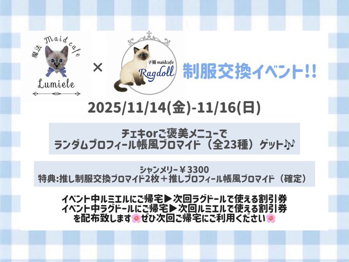 難波・日本橋 魔法maidcafe Lumiele𝐋𝐮𝐦𝐢𝐞𝐥𝐞🪄︎︎魔法メイドカフェルミエルさんがリポストもなか🩷Lumiele@Lum_mnk·おきゅいん❕ 15-19時です!つなーなさんと!!♡ ラグドール衣装ほんとにかわいいです🐱💖もなかちょーかわいい記念にチェキなど!! 遠隔こちらから🎀 http://mrnmrn.theshop.jp 🎀 Access🏠🌱魔法maidcafe Lumiele 大阪府大阪市浪速区日本橋4-17-17 3階 #メイドカフェ #大阪 #オタロード #日本橋𝐋𝐮𝐦𝐢𝐞𝐥𝐞🪄︎︎魔法メイドカフェルミエル3231,019