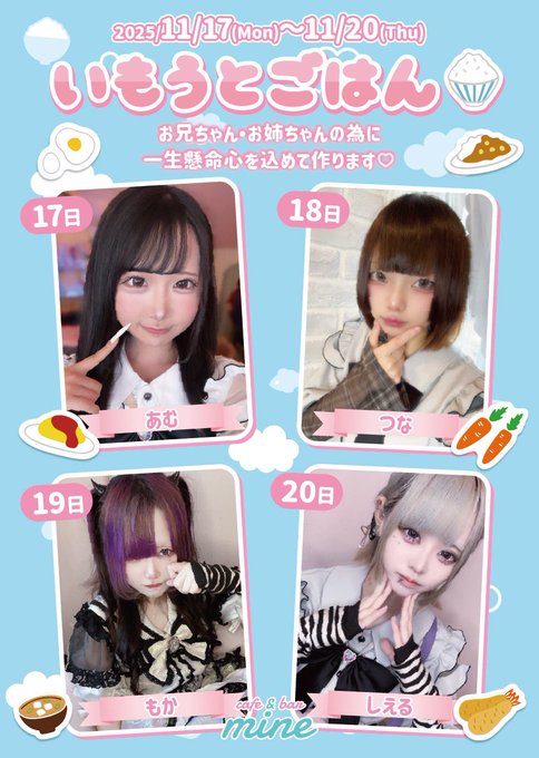 難波・日本橋 まいんつな@mine@tsuna__mine·11月16日つくりますよ引用まいん🎀いもうとコンカフェ@mine1201_·11月13日🎀まいんいべんとにゅーす🎀 【いもとう💛ごはん🍳】 ✨2025/11/17-11/20✨ 🍙17日 あむ飯@amu_mine 🍜18日 つな飯@tsuna__mine 🍛19日 もか飯@moka_mine_ 🍔20日 しえる飯@ciel_mine_ いもうとたちが心を込めてごはんを作ります🎶食べに来てね❓まってるよ✨18255