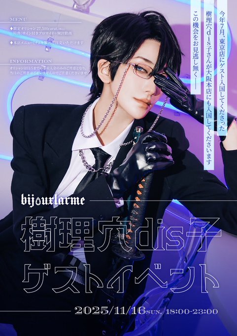 難波・日本橋 ビジュラム 大阪本店リウ@ビジュラム大阪本店@bjlm_riu·11月16日ついに当日に! 18:00から樹理穴dis子様が入国されます!!!!!! この機会をお見逃しなく✨✨ ぜひお越しくださいませ💫引用ビジュラム大阪本店┃日本橋💎男装コンカフェ@bjlm_osaka·11月16日‧✧̣̥̇‧✦‧✧̣̥̇‧Special Event‧✧̣̥̇‧✦‧✧̣̥̇‧ 東京店に来て下さった樹理穴dis子さん(@Juriana_disko )が この度大阪本店にも入国💎 お席のご予約 他詳細は画像をご参照ください໒꒱ この機会をお見逃し無く❕ 2025/11/16(日)18:00-23:002364