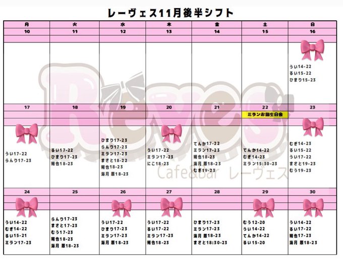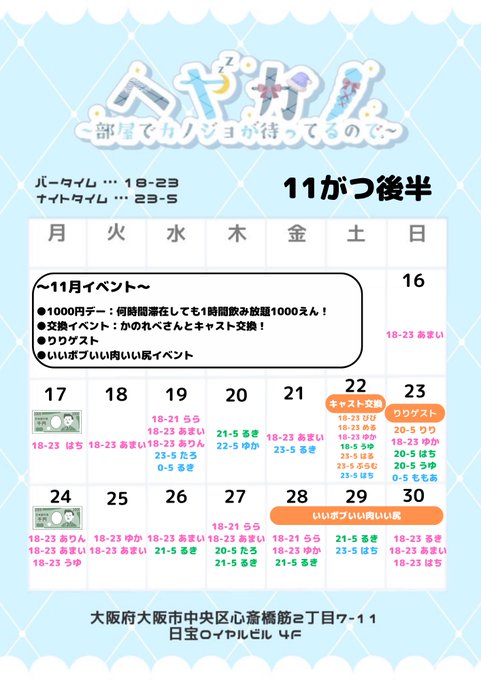 難波・日本橋 ソルシエール固定ぅぃ@reves_ui·11月後半いてる日です🎀 いっぱいいてるので来店まってます!8244