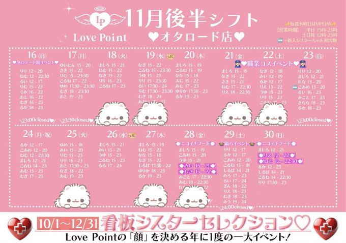 難波・日本橋 LovePoint固定なぎにゃんころ🍓ラブポイント@LP_nagi_·꒰͙ 11月後半シフト ꒱͙ 16日冬のデート服イベ⛄️❄️ 21~23日職業コスイベ👩🏻🍳🌟 28日みいなぎニコイチフードイベ🍽💗 29日鍋パイベント🍲💭 30日りえねむニコイチフードイベ🍽💗 初のフードイベします>⩊