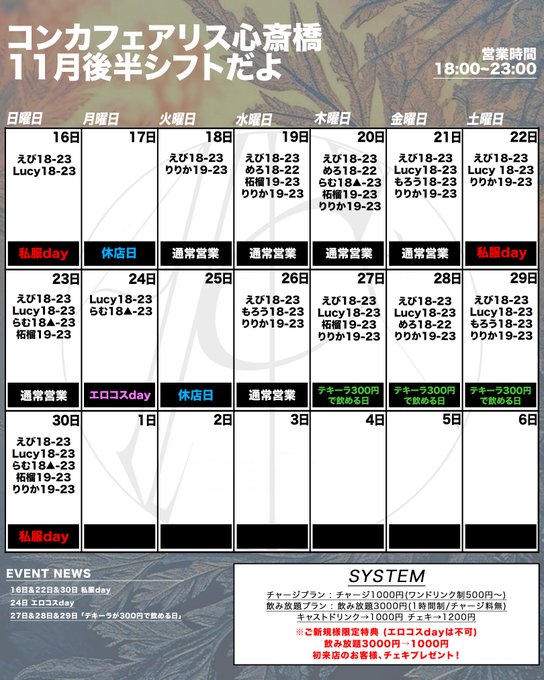 心斎橋・ 宗右衛門 夜はまるで――のように夜はまるでーーのように |道頓堀・宗右衛門町店@yoruhamarude·🌙11月前半シフト🌙 営業時間 ♡20:00~05:00 🌙19〜24日夜まる4周年イベント🌙 【遠隔メニュー】http://yoruhamarude.base.shop #コンカフェ大阪 #宗右衛門町11164