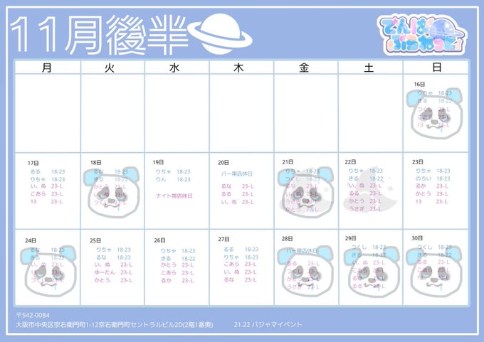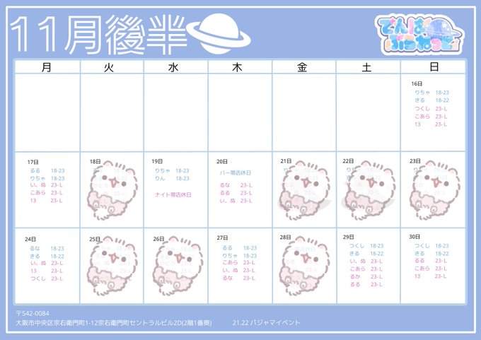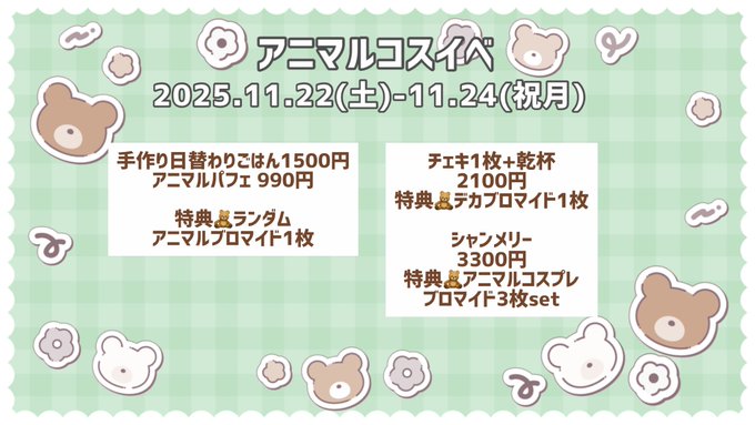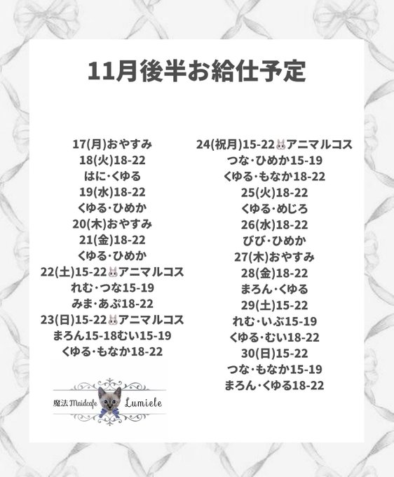 難波・日本橋 魔法maidcafe Lumiele固定𝐋𝐮𝐦𝐢𝐞𝐥𝐞🪄︎︎魔法メイドカフェルミエル@Lumiele_maid·୨୧┈┈┈┈┈┈┈┈┈୨୧⑅*。 魔法maidcafe Lumiele 11月後半給仕予定表🪄⌒♡ 🌸➰Event➰🌸 22(土)-24(祝月)アニマルコスイベ🧸🍯 皆様のご帰宅を心よりお待ちしております🐈⬛315938