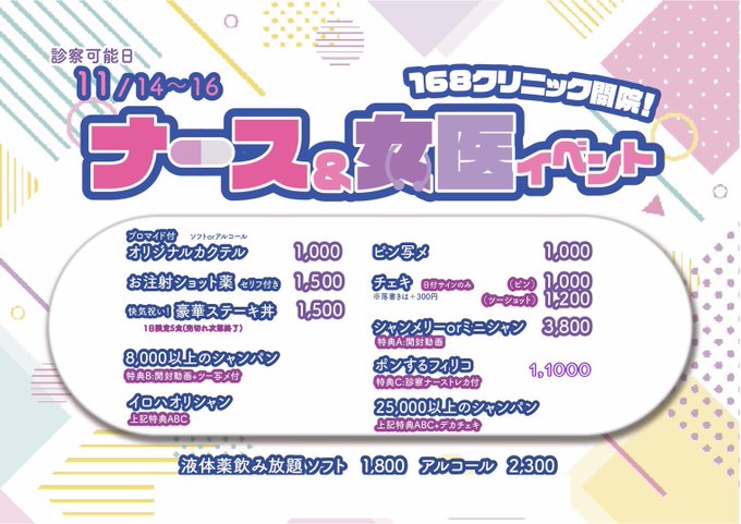 かれん@karen__168·11月15日ナースさん今日と明日、います💉💉引用💎episode168💎店休日11/17.18.25@episode168·11月14日💉イロハクリニック開院🏥 診察可能日▶︎11/14(金)〜11/16(日) 今回のフードは 1日5食限定‼️快気祝い豪華ステーキ丼🥩 効き目抜群お注射ショット薬💉(台詞付き) 今日の症状は…「推し不足」?🩺 甘くて危険な“特効薬”、お出しします💉✨ #大阪 #日本橋 #コンカフェ #オタロード #イベント x.com/episode168/sta…15892