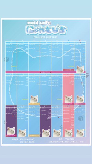 難波・日本橋 🐾にゃんとぴあ🐾(ねこぴ)まろん@ねこぴ@maron_nekopi·11月後半シフトです🔥✨ 就任式🌸㊗️ せいらさん生誕👑 素敵な予定が沢山(୨୧ ❛ᴗ❛)✧ まってまろーん🌰4213