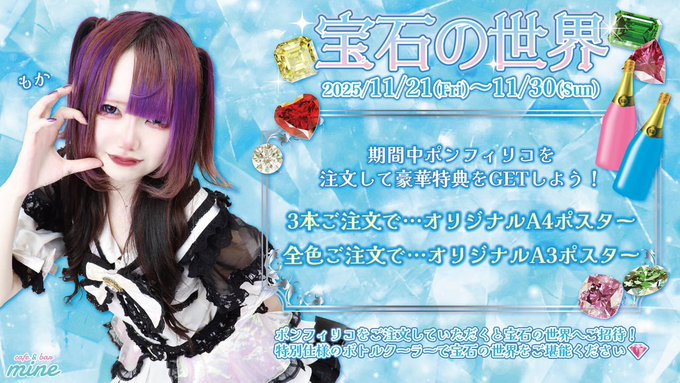 難波・日本橋 まいんみるく@mine@milk__mine_·7時間きらきらポンフィリコ! 全色開くの夢ですね💭🌟引用まいん🎀いもうとコンカフェ@mine1201_·11月13日🎀まいんいべんとにゅーす🎀 【⊹₊✨⟡⋆˚⊹宝石の世界⊹₊⟡⋆✨˚⊹】 💎2025/11/21~11/30💎 キラキラ輝く宝石のようなポンフィリコ✨いもうとちゃんと宝石の世界をたのしみましょう✨✨💎3202