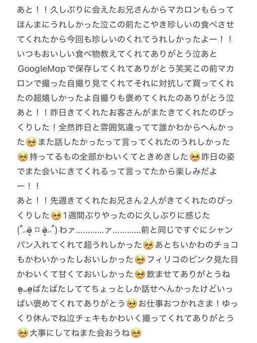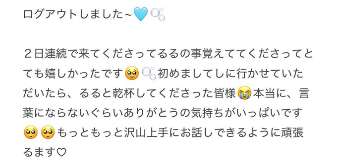 難波・日本橋 まいんのあ@mine@noa__mine·20時間ろぐあうと! 今日はパルファンからまむちゃんとつきちゃんが来てくれてて!!めーちゃたのしかったです!♡みんなありがとうございます🌟 そして今日もあむちゃんといっぱい笑いました♩あむちゃんお兄ちゃんありがとうございました> ₃