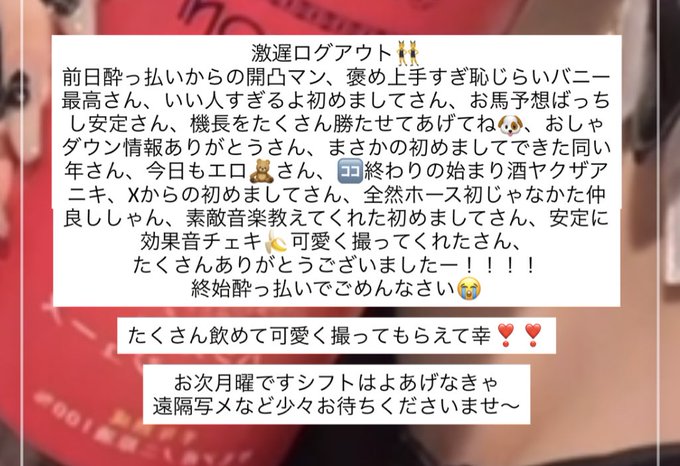 難波・日本橋 まほろばまほろば🪭さんがリポストましろは病みません@White_sukisuki·バニーイベろぐあ!初めましてさん、明日も来てくれるのに今日も来てくれたいつもましてさん、みんなにも優しいさん、可愛い女2人組さん、すぐ帰っちゃったさん🐱😢、ぴかおりとかTシャツとかくれた2人さん ꪔ̤ ꪔ̤、ショット飲ませてくれた常連様、ありがとうございましたᵕ̩̩_ᵕᵕ̩̩_ᵕ111417