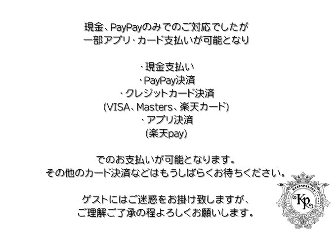 難波・日本橋 クラパラりりあ@クラパラさんがリポストクラパラ┃大阪・日本橋🦉童話コンカフェ@KlePala1020·【お知らせ】 リニューアルオープンから 現金、paypayのみの支払い方法でしたが 本日より一部カード決済、アプリ決済が 可能となりました。 他の支払い方法につきましても 随時利用可能となりますので もうしばらくお待ちいただきますよう ご理解ご了承のほどよろしくお願いいたします。921760