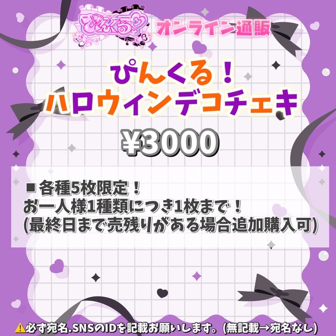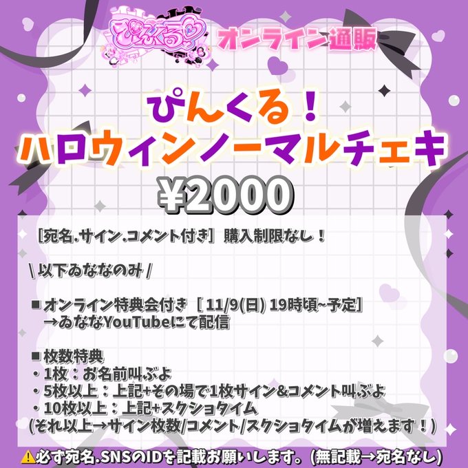 難波・日本橋 cafe&bar princess princessゐなな@inana_aa·4時間本日19時頃〜予定していたオンライン特典会ですが、21時〜に変更となります! ゐなな公式YouTube配信にておこないます! 通販チェキのお名前読んだり、サイン書いたりします✍️🌟 たくさんコメントして盛り上げてね〜!!💖 ⬇️ここから視聴できます(͒ ᴖ ·̫ ᴖ⸝⸝ )͒♪ https://youtube.com/live/jUkzp82_9V0?si=5l2OUR7MDzWUkrbi…引用ぴんくる!@Pinkle_official·10月30日. / 💗🎃ぴんくる!ハロウィン チェキオンライン販売!🖤🦇 \ ■ノーマルチェキ:1枚¥2000 ・ゐななのみオンライン特典会付き 🔗 https://pinkle.base.shop/items/123667840 ■デコチェキ:1枚¥3000 ・各衣装5枚限定! 🔗 https://pinkle.base.shop/items/123676286 🛒販売期間10/30 19:00〜11/7 23:594211,871