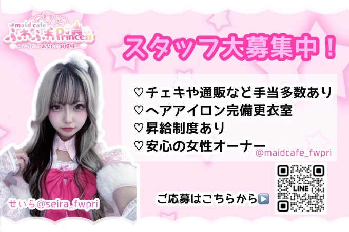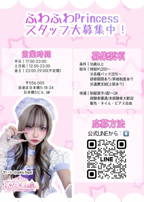 難波・日本橋 ☁️ふわふわPrincess☁️☁ふわふわPrincess☁(ふわぷり)@maidcafe_fwpri·スタッフ大募集❕ 画像をご確認の上公式LINEからご応募お待ちしております🎀 #コンカフェ求人 #日本橋 #コンカフェ募集 #メイドちゃん募集中185