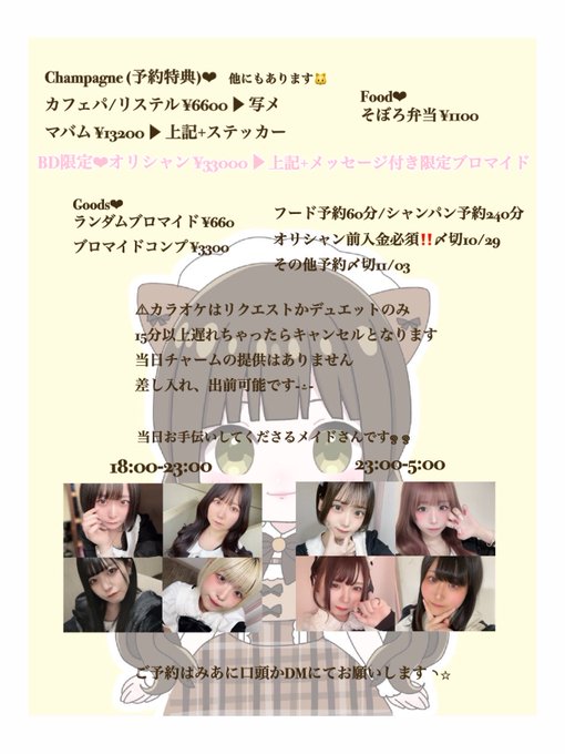 難波・日本橋 りとるべるメイドbar🔔りとるべる@littlebell0801·🌼💛11/8(土)お留守番めいど💛🌼 \みあ生誕/ 🎂18-5 みあ 💛18-23 あむ ましろ しのぶ りんね 🌼23-5 みぃ うる なぎさ Sherry みあ生誕です🎂💛🌼 沢山のお祝いお待ちしております🍾🥂✨ #りとるべる42475