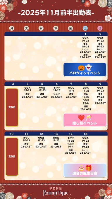 心斎橋・ 宗右衛門 Romantique(ろまんてぃーく) ミナミコンカフェ固定聖(ひじり)@hijiri_roman·53分いる日少ないけど会いに来てください🥹引用大阪ミナミのコンカフェ Romantique(ろまんてぃーく)@RomantiqueCafe·55分🩵11月前半出勤予定表のお知らせ🧡 ▽2025年11月7日(金)〜11月9日(日) 〜推し祭りイベント〜 ▽2025年11月14日(金)〜11月16日(日) 〜透音お誕生日会〜 ▽公式HP http://romantique.moe ▽求人 http://romantique.moe/recruit/ #コンカフェ #コンカフェ大阪 #ミナミコンカフェ #ミナミ #大正浪漫29