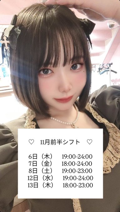 難波・日本橋 Lumiereみゅあ@___3yua·♡11月前半♡ 7日(金)15-23 8日(土)15-22 12日(水)15-23 14日(金)15-23 15日(土)15-23 久しぶりのフリー出勤=独り占めできちゃいます!来店予約待ってます(ˆ꜆ . ̫ . )♡ #コンカフェ嬢 #日本橋コンカフェ #オタロード #Lumiere #自撮り界隈 #コンカフェ営業Lumière【大阪日本橋コンカフェ】460