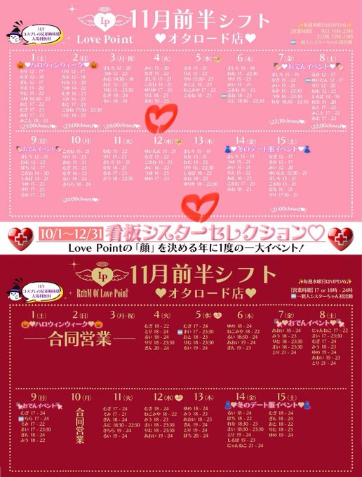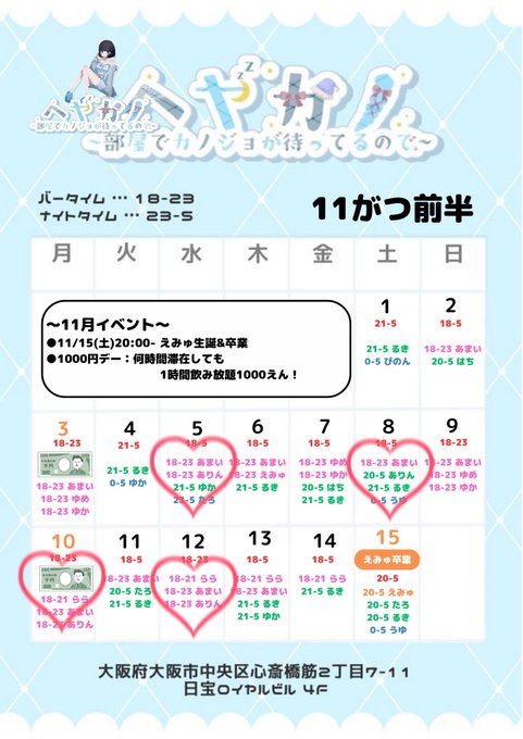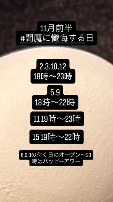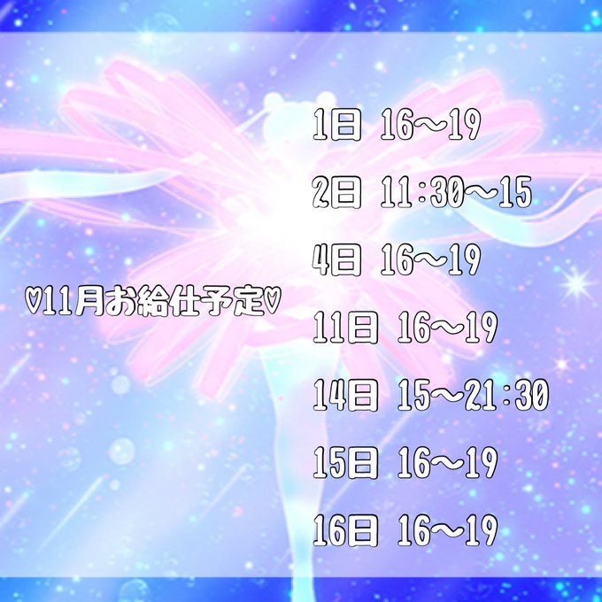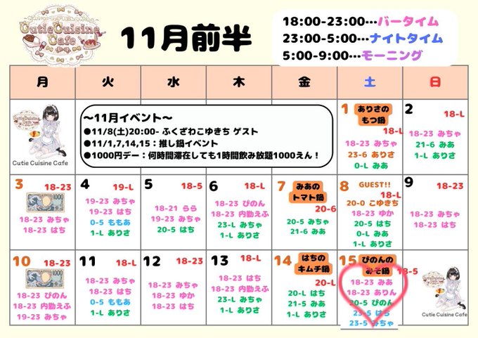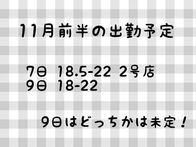 固定ゆぴ@168xupl·11月前半 9日 17-23 11日 19-23 12日 18-23 16日 17-23 店休日 4.5.10日26408