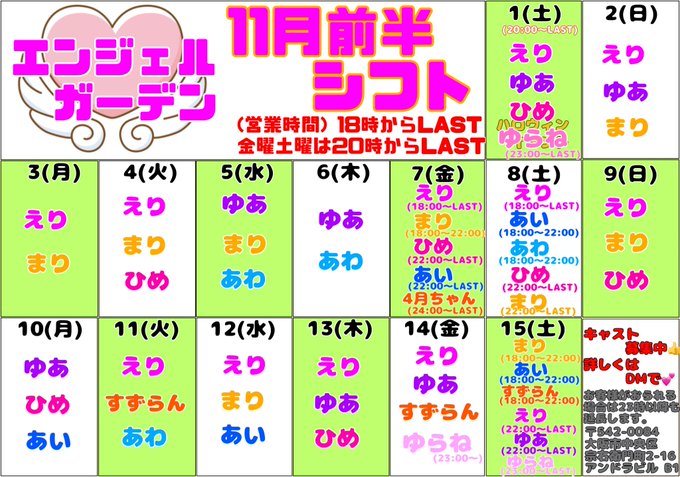 心斎橋・ 宗右衛門 エンジェルガーデン-天使の箱庭-固定エンジェルガーデン-天使の箱庭-@Angel__Garden·✨11月前半シフト✨ ✨11月1日 ✨ハロウィンイベント🎃 是非お待ちしております👼🏻 #コンカフェ #大阪コンカフェ #宗右衛門町 #コンカフェ嬢 #コンカフェキャスト #コンカフェ好きな人と繋がりたい111,029