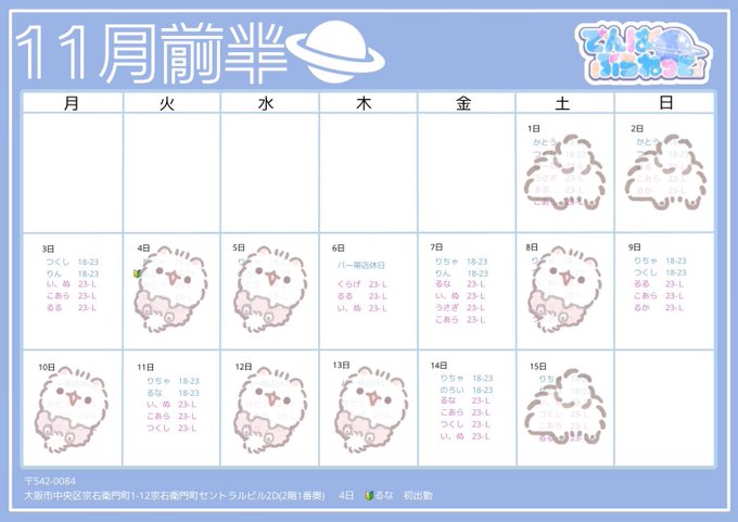 難波・日本橋 りとるべるメイドbar🔔りとるべる@littlebell0801·【📣お知らせ】 🗓11月前半シフト🍂 8日 みあ生誕🎂💛 11/1〜おでん🍢始めます✨ 把握よろしくお願いいたします🙇♀️3151