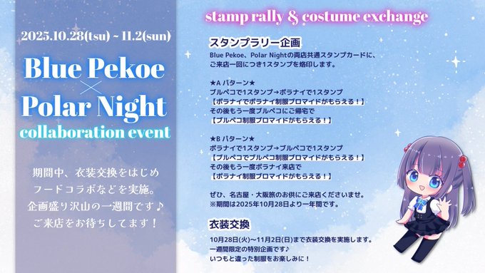 心斎橋・ 宗右衛門 サブカル深夜喫茶 Polar Nightるな Polarnight🌙☕️@pn_runa·ポラナイおぷん❣️ 今日はブルペコさんの制服でお待ちしております❤️サブカル深夜喫茶 Polar Night🌙☕️211389