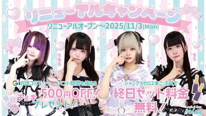 難波・日本橋 まいんちう@mine@chiu_mine·12時間お得意やさん꒰՞ɞ̴̶̷⩊ɞ̴̶̷꒱֯🍼︎引用まいん🎀いもうとコンカフェ@mine1201_·10月26日🎀まいんいべんとにゅーす🎀 🎉【リニューアルキャンペーン】🎉 10/27-11/3 ・Google口コミ記入でチェキ500円OFF❣️ ・シャンブラゼロ2本ご注文で終日セット料金無料🆓✨✨ リニューアルオープンをお得に楽しんじゃおう🎶🉐15305