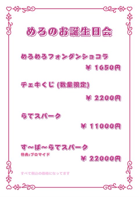 難波・日本橋 micoざくらくるるさんがリポストめろ♡ @らてめぃど@mero_latte2·13時間明日は黒門店の方にいます!!引用めろ♡ @らてめぃど@mero_latte2·18時間♥めろのお誕生日会メニュー♥ 2025/10/26(日) 明日開催するお誕生会のメニュー になりますᐡ ̳ᴗ ̫ ᴗ ̳ᐡ❤︎ 限定フード、限定メニューです! ボトルのご予約をDMにて承ります! またイベントのご質問はリプかご入国の際に直接お願いします!137544