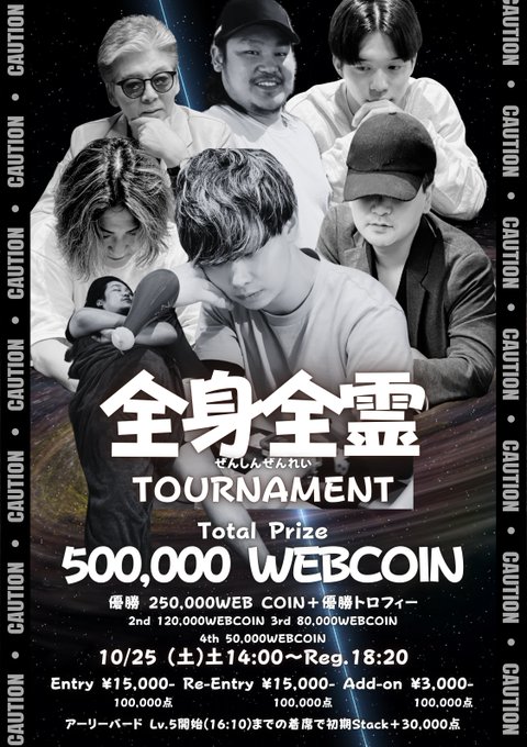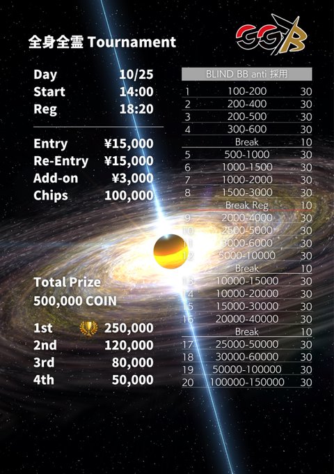 心斎橋・ 宗右衛門 GoodGame&BluffGoodGame&Bluff_GGB@GGB_osaka·【🍶10/25 全身全霊Tournament🍶】 📅開催日:10月25日(土) ⏰Start:14:00 / Late Reg:18:20 💸Entry:¥15,000 ♻️Re-Entry:¥15,000 💰Add-on:¥3,000 🎯Start Chips:100,000 🐤Early Bird:Lv.5(16:10)までの着席で 初期Stack+30,000点 🎁Prize:500,000 WebCoin‼️411.2万