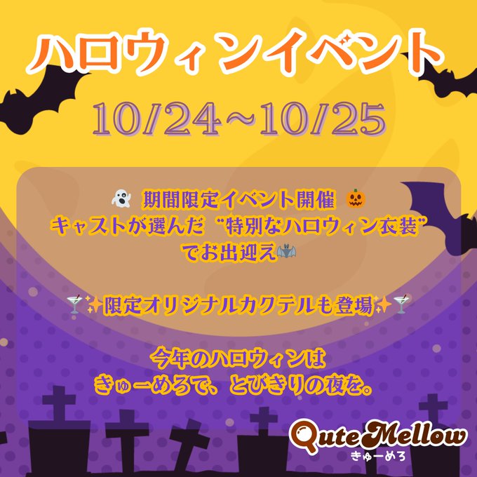 難波・日本橋 Cafe&Bar QuteMellow -きゅーめろ-あんな🎀@annatan_0319·13時間たのしみすぎゆーーー❣️❣️ あんなは25日います🫶🏻何するかはお楽しみに😽💞引用QuteMellow 大阪日本橋【コンカフェ】きゅーめろ@qutemellow·10月23日🎃🦇Qute Mellow HALLOWEEN 2025 開催🎃🕯️ 期間中はキャストが選んだ特別なハロウィン衣装でお出迎え🖤 ここでしか味わえない限定オリジナルカクテルも登場🍸✨ 🕸️今年のハロウィンは、きゅーめろでとびきりの夜を。 📅 開催期間:10月24日(金)〜10月25日(土) 10月24日(金) ましろ 18:00〜さらに表示1103