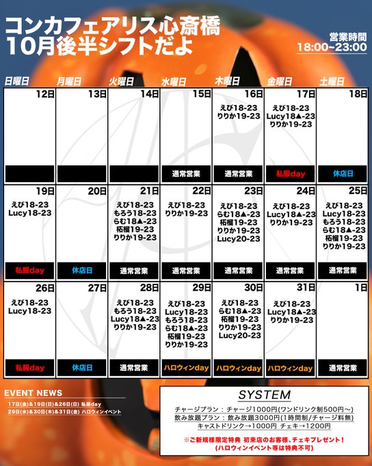 心斎橋・ 宗右衛門 コンカフェアリス心斎橋コンカフェアリス心斎橋@CAFEBARALICE3·10月23日ハロウィンイベント時の新規特典は無効となります。 ご了承くださいませ👻引用コンカフェアリス心斎橋@CAFEBARALICE3·10月15日10月後半シフト ハロインイベントが末に開催だよ☆ http://instagram.com/cafebaralice/ http://tiktok.com/@cafebar_alice 皆様のご来店をお待ちしております。17931
