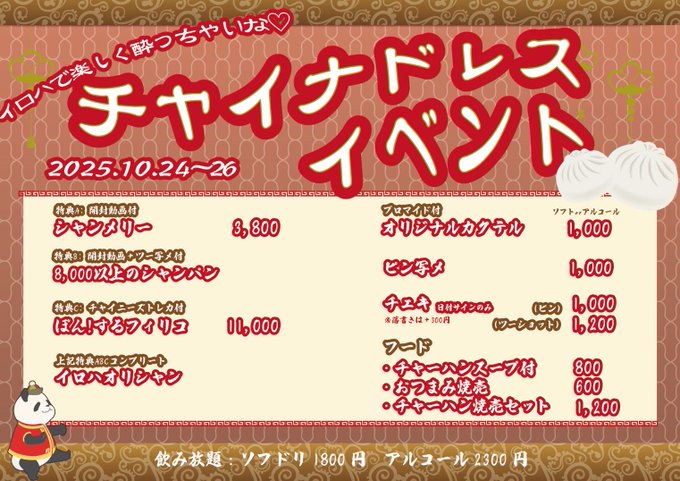 ゆぴ@168xupl·20時間今日からだよー!フードもいっぱい🇨🇳引用💎episode168💎店休日10/27@episode168·10月22日💎イベント告知💎 10/24(金)〜10/26(日) イロハで楽しく酔っちゃいな❣️ チャイナドレスイベント🐼 今回のフードは チャーハンに焼売さらにセットにもできちゃう🙌 艶やかなチャイナのきらめきに包まれて 今宵は少しだけ特別な時間を✨ #大阪 #日本橋 #コンカフェ #オタロード #イベント x.com/episode168/sta…17776
