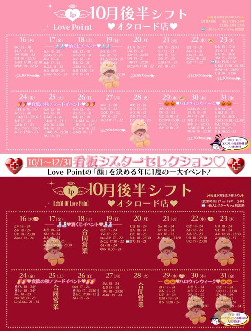 難波・日本橋 ソルシエール固定もも@sorciereMo_mo·🤍10月後半シフト🤍 チャイナイベ🇨🇳 ハロウィンイベ🎃👻 イベント沢山だよ!絶対会いに来て♡4141