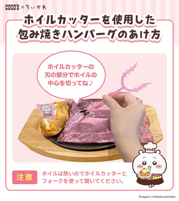 心斎橋・ 宗右衛門 SFG -サンフラワーガーデン-क॑ 𡿨Ʊ゙チャン🥱さんがリポストココス【公式】@cocos_campaign·#ココス × #ちいかわ 📢10/16(木)よりキャンペーン開始✨ 第1~3弾のコラボメニューの包み焼きハンバーグは オリジナルのホイルカッター付き🎵 ホイルカッターの刃の部分でホイルの中心を切ってお召し上がりください🍴 🔻詳細 https://bit.ly/3VvC1uP #ココスでちいかわ213,0651.2万98万