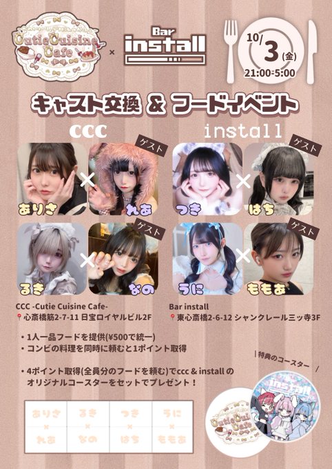 心斎橋・ 宗右衛門 Cutie Cuisine Cafeももあ 🍑さんがリポストCCC -Cutie Cuisine Cafe-@大阪ミナミのお料理コンカフェ@cutie_cuisine·10/3(金) 21:00-5:00 ccc @cutie_cuisine ×install @bar_install キャスト交換&フードイベント 🍳CCC ありさ @genkai_insyu ×れあ@osushinigiru__ るき@ruki_1018_0 ×なの @lv___x3 👾install つき@tukichanman_ ×はち@_hciiico うに@zettaineko × ももあ@momo_a_1729653,540