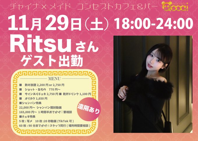心斎橋・ 宗右衛門 Qooai茴さんがリポストRitsu@11/29大阪ゲスト@nya0w0___·10時間本日よろしくお願いしますᐡ ɞ̴̶̷ ̫ ᴗ̤ ᐡ引用Qooai 心斎橋ミナミ本店【コンカフェ】@Qooai_·11月7日11月29日(土)18:00-24:00 Ritsuさん @nya0w0___ ゲスト出勤🐼 遠隔はこちらから注文可能です🍾 https://qooai.kawaiishop.jp ■営業時間■ 毎日18:00-翌6:00 ■住所■ 大阪府大阪市中央区東心斎橋2-1-10 新栄プロパティー八幡3階 ■料金■ 飲み放題 1時間 《パンダコース》2,200円 《ドラゴンコース》さらに表示1253,107