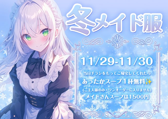 難波・日本橋 メイドカフェりきゅうメイドカフェ🍴りきゅう🤍公式⟡@rikyuu_midcf·本日のお給仕情報🪄◝✩ ❄️冬メイド服イベント開催中❄️ 15時💎 ひなちゃん 不在ちゃん らいくん 18時💎 のえるちゃん ◌⑅◌⑅◌⑅◌◌⑅◌⑅◌⑅◌ #メイドカフェ #コンカフェ22124