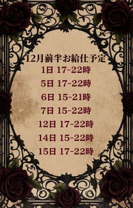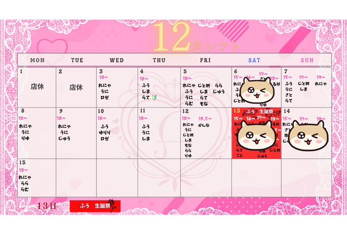 難波・日本橋 じゃぱにーずKAWAiiまゆ💟@ma_yu_jap·♡12月前半予定です♡ 13日にはるんちゃんのお誕生日会もあるからぜひ行ってね〜! ひっそりですがまゆも12月お誕生月なのでちょこっとキャンペーンやってます!ぜひ🐈2125