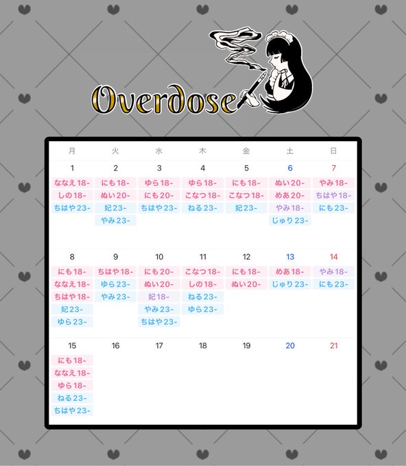 難波・日本橋 Overdose固定Overdose@SB_Overdos·12月前半のお給仕予定︎🌙 ※ピンク...バー帯、ブルー…ナイト帯、パープル…通し ⚠予定は予告なく変更になる場合がございます23140