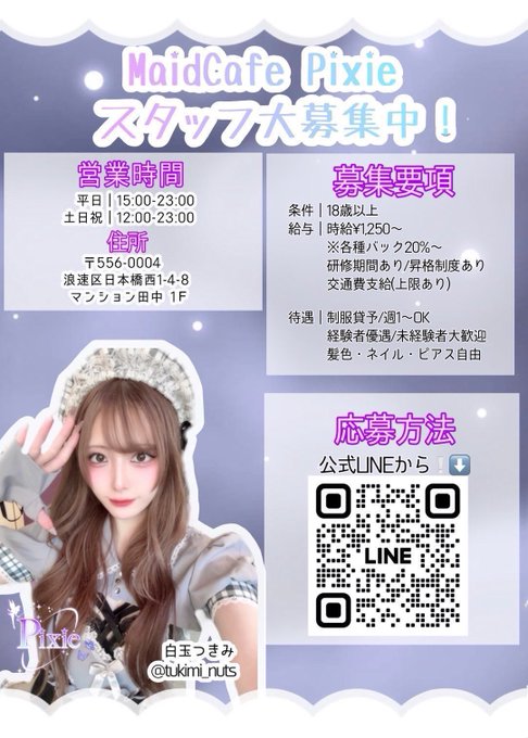 難波・日本橋 MaidCafe Pixie🦋🧚♀️MaidCafe Pixie🧚♀️🦋@maidcafe_pixie·スタッフ大募集❕ 画像をご確認の上公式LINEからご応募お待ちしております🎀 ご応募はこちらから⬇️♡ 【http://lin.ee/RrorMlu】 #コンカフェ求人 #日本橋 #コンカフェ募集 #メイドちゃん募集中279