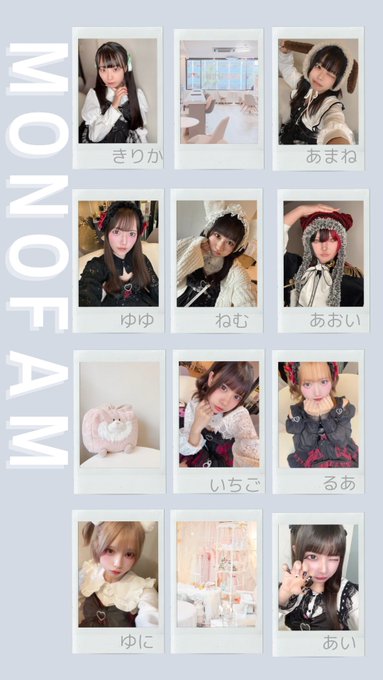 難波・日本橋 monoFam☀️ m o n o F a m 🌙@monofam_··̩͙꒰ঌ𝐨𝐩𝐞𝐧໒꒱·̩͙ -18 あまね@amasano6 12-20 あおい@aoi_monofam 12-21 ねむ@harapecoNemuchi 12-22 きりか@kirika_000 ゆゆ@yuyu_monofam 12-23 あい@_amahaneai_ るあ@rua_chan0901 いちご@_ichigo_w 18-22 ゆに@p_qw32 いちご卒業です🍓🎓1463
