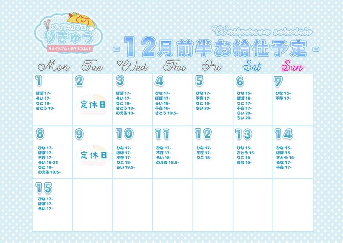 難波・日本橋 メイドカフェりきゅう固定メイドカフェ🍴りきゅう🤍公式⟡@rikyuu_midcf·12月前半お給仕予定表🪄︎︎◝✩ シフトは追加になる場合もございます! 毎日りきゅうをチェックしてね! 𓈒𓏸𓈒꙳ 12月前半イベント ♥12/6-12/7 デートコーデイベント💖 ♥12/13-12/14 ♦️カジノイベント ♠️13168