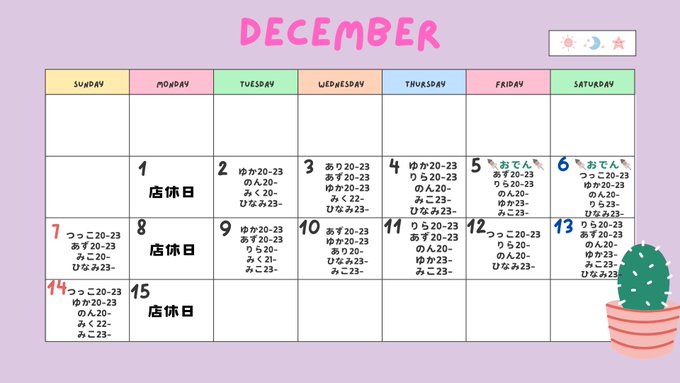 難波・日本橋 micoざくら固定ひめ🦀❤️LIVE♡12/16.18@hime_monoclub·🦀12月のお給仕表🦀 🥀メリメロ 🌸micoざくら 🌻mono CLUB 🐈観光 ❌🏠お休み(実家) 🎤ライブ 1.5.12.17.26日‥17-22 8.19.25日‥16-22 7.20.27.28.29日‥12-22 21日‥12-18 12月の土日祝は珍しく昼12時からいる日もあるので是非会いに来てほしいです✨ 観光予約や来店予約もお待ちしてます🎶16216