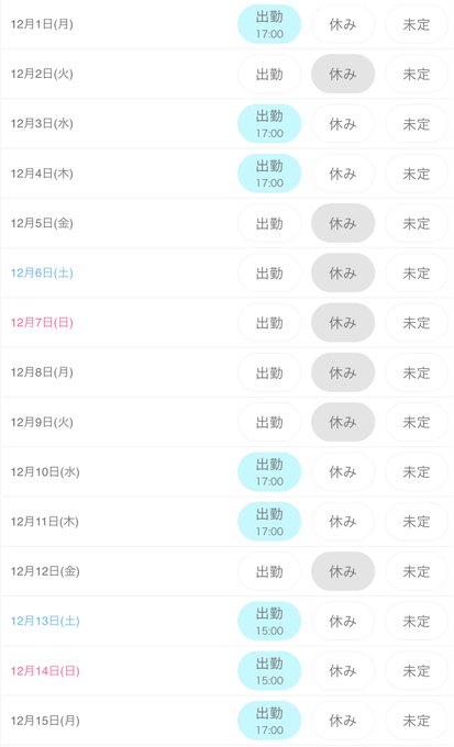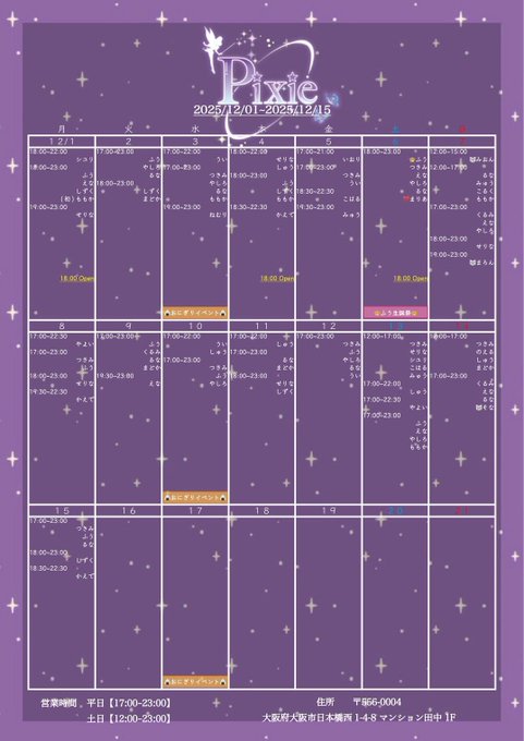 難波・日本橋 ソルシエール固定ある🐈⬛(ばけねこ)@sorciere_aru·12月前半しふと 2日 17〜22 6日 15〜22 7日 15〜20 9日 17〜22 13日 15〜22 14日 15〜20 簡潔に言うと火、土、日、い、ま、す19181